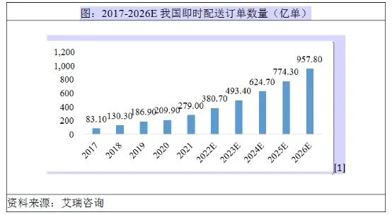 根據(jù)艾瑞咨詢《中國即時配送行業(yè)趨勢研究報告(2022年)》,2026年我國即時配送服務行業(yè)訂單規(guī)模將接近千億量級,達957.8億單,2021年-2026年復合增長率為28.0%,行業(yè)整體仍處于快速發(fā)展路線上。